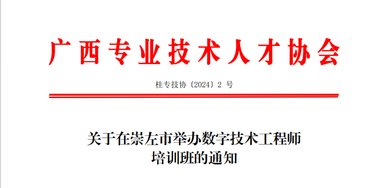 各机关部门、各企事业单位: 为贯彻落实《人力资源社会保障部 中共中央组织部 中央网信办 国家发展改革委 教育部 科技部 工业和信息化部 财政部 国家数据局关于印发〈加快数字人才培育支撑数字经济发展行动方案(2024-2026)〉的通知》(人社部发【2024】37号)和自治区九部门的实施方案,更好满足广大科技工作者及在校大学生的强烈愿望和迫切需要,决定面向崇左市及所辖县市区举办数字技术工程师培训班。现将有关事项通知如下: